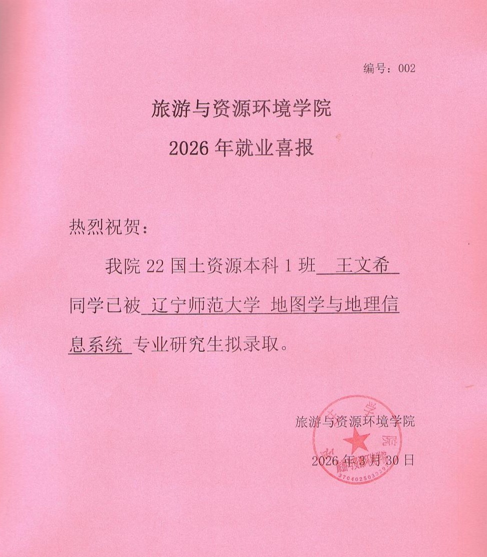 喜报!22国土资源本科1班王文希被辽宁师范大学录取!