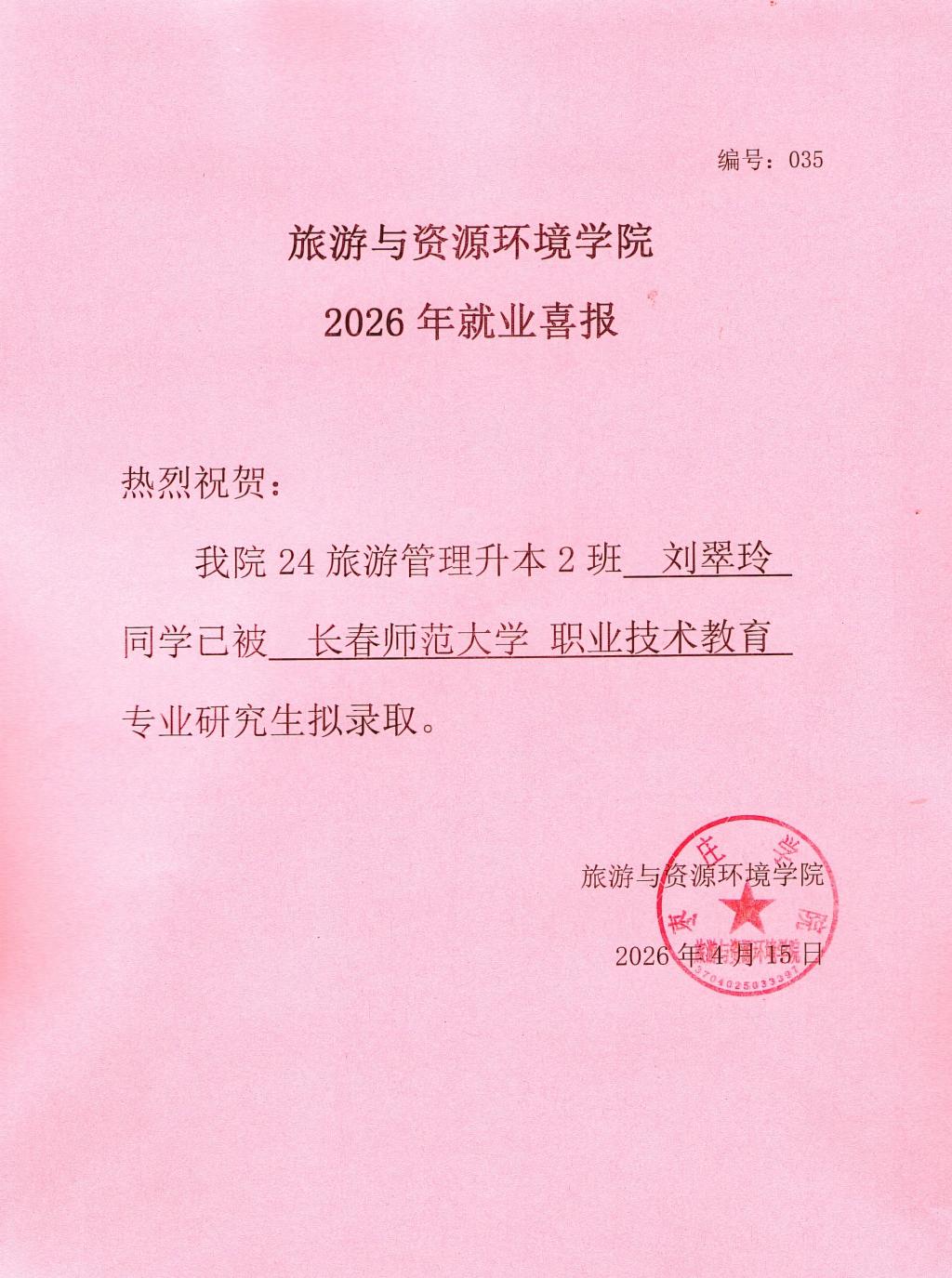 喜报!24旅游管理升本2班刘翠玲被长春师范大学录取!